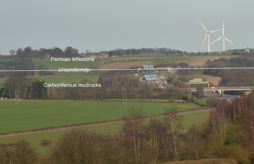 Figure 1 – West facing scarp slope formed where the hard, Permian age dolomitic limestones overlie soft, Carboniferous mudrocks, M1, Garforth